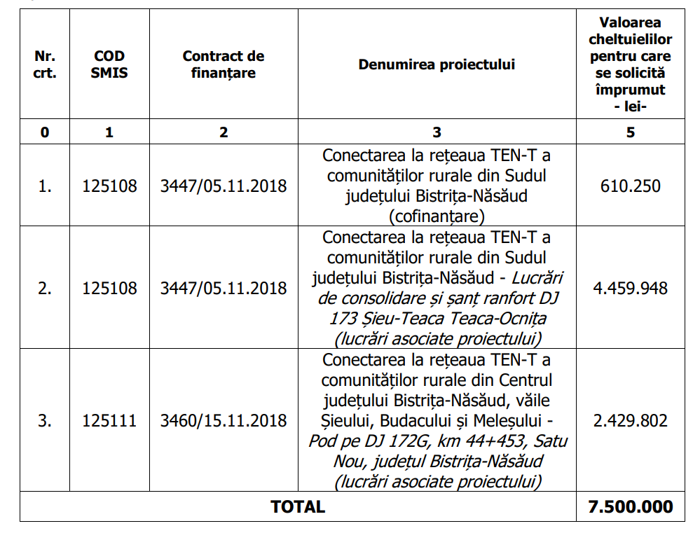 De asemenea, suma de circa 610.000 lei va fi folosită pentru asigurarea cofinanțării proiectului ”Conectarea la rețeaua TEN-T a comunităților rurale din sudul județului Bistrița-Năsăud”, proiect derulat în cadrul Programului Operațional Regional 2014-2020, banii fiind necesari în vederea finalizării proiectului până la data de 31.12.2023, așa cum prevede contractul de finanțare.