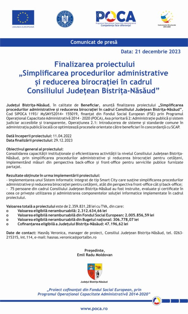 Proiectul intitulat ”Simplificarea procedurilor administrative și reducerea birocrației în cadrul Consiliului Județean Bistrița-Năsăud” a fost finanțat din Fondul Social European (FSE) prin Programul Operațional Capacitate Administrativă 2014 – 2020 (POCA) și a avut o valoare totală de circa 2,4 milioane lei.