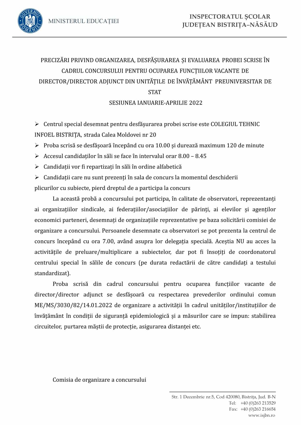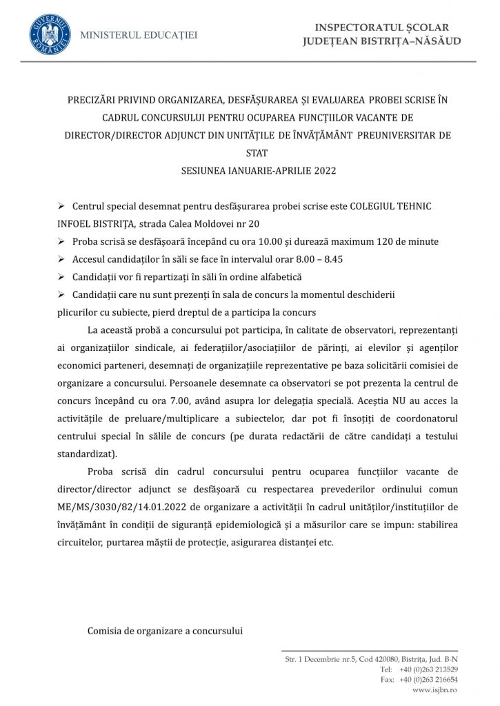 Cea de-a doua sesiune a concursului pentru ocuparea funcțiilor de directori în școli continuă prin organizarea probei scrise, programată a se desfășura la data de 18 februarie. Un număr de 49 de candidați declarați admiși în urma verificării dosarelor de înscriere sunt așteptați să susțină examenul, informează Inspectoratul Școlar Județean Bistrița-Năsăud.