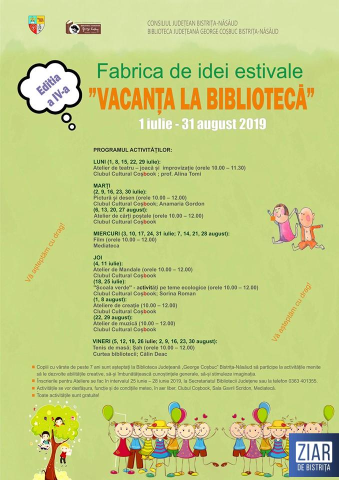 Consiliul Județean Bistrița-Năsăud și Biblioteca Județeană „George Coșbuc” Bistrița-Năsăud organizează în perioada 1 iulie – 31 august 2019, cea de-a IV-a ediție a Fabricii de Idei Estivale – „Vacanță la Bibliotecă”.