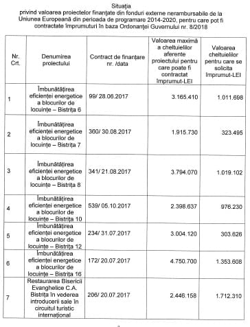 La finalul anului 2018, Primăria Bistrița a rămas fără bani și s-a accesat un împrumut pentru co-finanțarea unor proiecte europene. Asta deoarece administrația locală și-a cheltuit bugetul.