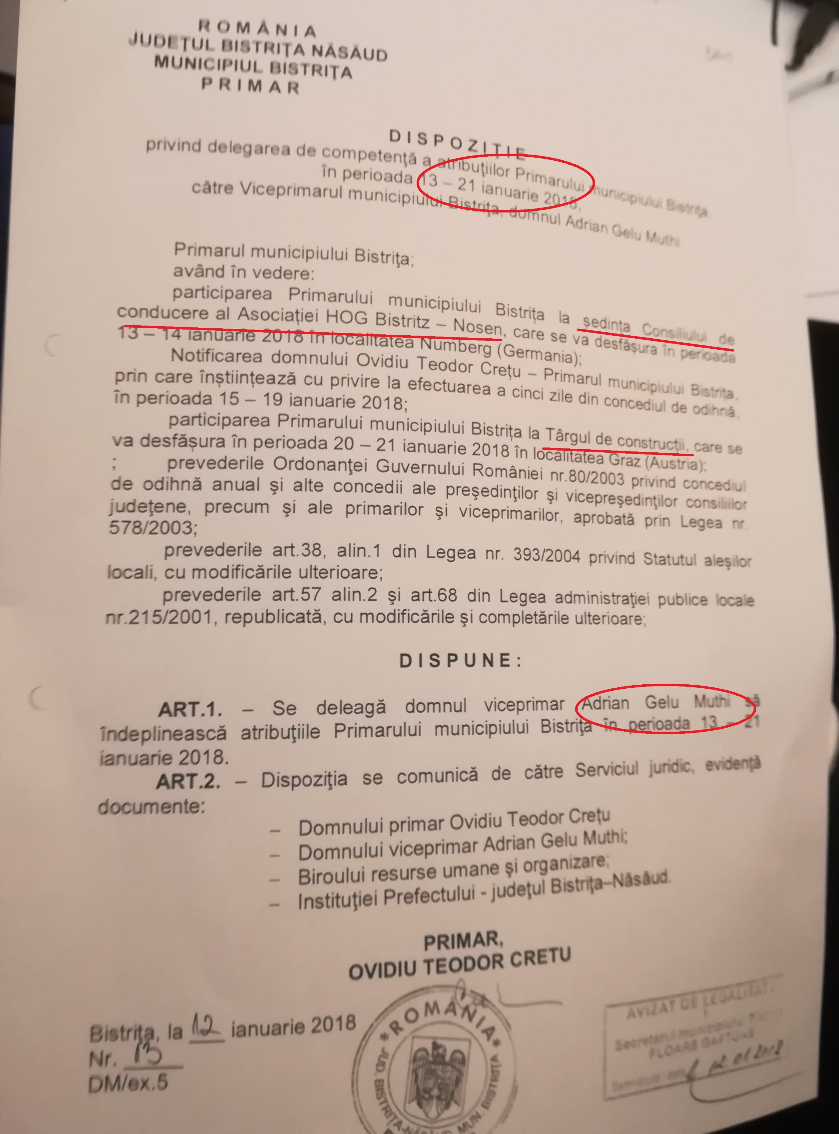 Conform datelor oficiale, pentru primarul Bistriței au urmat 5 zile de concediu, în perioada 19 – 24 ianuarie. După care a urmat o participare la târgul de construcții din Austria (Graz) în perioada 20 – 21 ianuarie. (chiar dacă era weekend)