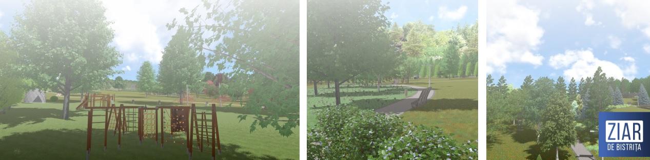• amenajarea parcului prin modelarea terenului, inclusiv plantarea de arbori și arbuști și crearea de zone cu vegetație specifice orașelor înfrățite cu Bistrița;