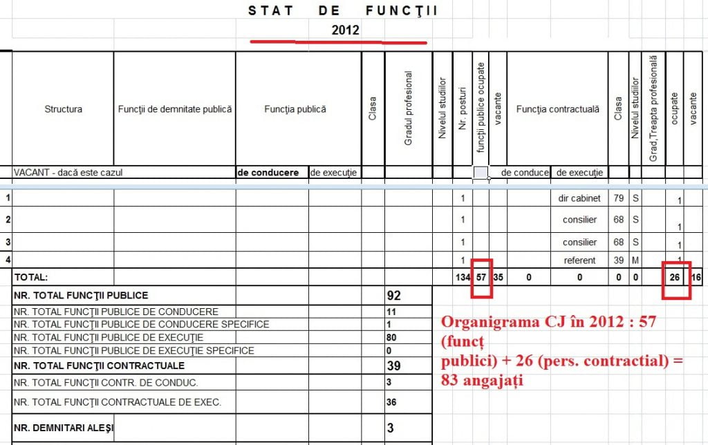 Spre comparație, în 2012, Radu Moldovan a preluat instituția cu 83 de posturi ocupate (funcționari publici + personal contractual). Radu Moldovan a păstrat fosta organigramă și NU a dat afară pe nimeni și a făcut unele schimbări: a înființat posturi și a re-organizat anumite Direcții!
