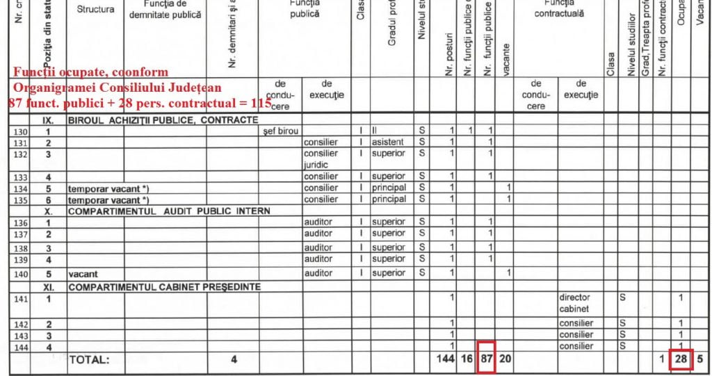 La această oră, Organigrama Consiliului Județean are în plus 32 de funcții ocupate, 115 posturi ocupate ( 87 funcționari publici și 28 ca personal contractual).
