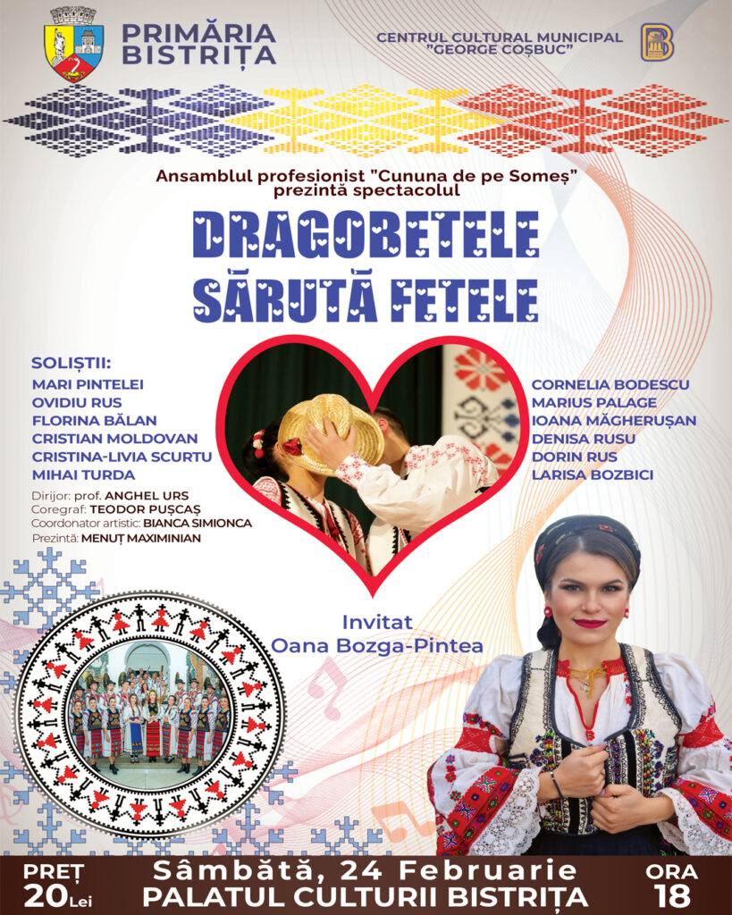 Spectacolul ”Dragobetele sărută fetele” va fi susținut de Ansamblul Profesionist ”Cununa de pe Someș”, cu soliștii Mari Pintelei, Ovidiu Rus, Florina Bălan, Cristian Moldovan, Cristina-Livia Scurtu, Mihai Turda, Cornelia Bodescu, Marius Palage, Ioana Măgherușan, Denisa Rusu, Dorin Rus și Larisa Bozbici.