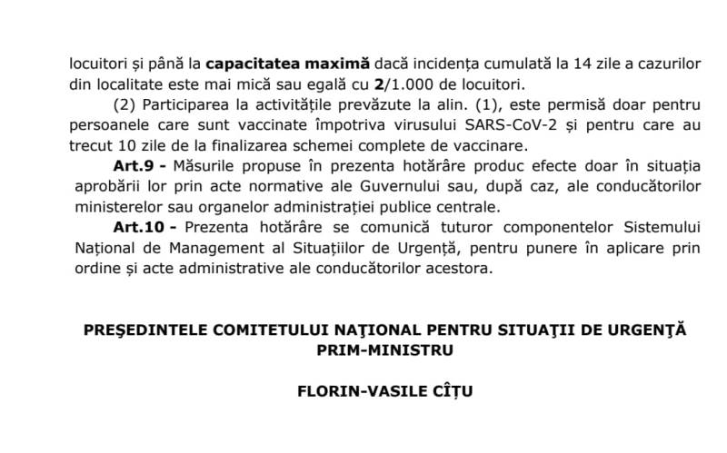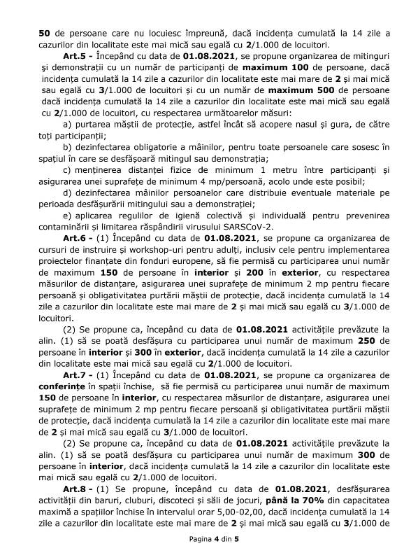 Radu Florescu iulie 27, 2021 689 Views Comitetul Naţional pentru Situaţii de Urgenţă a aprobat, în ultima şedinţă, o hotărâre privind noile măsuri de relaxare în contextul pandemiei de COVID-19, începând cu data de 1 august. Lista integrală a măsurilor poate fi consultată mai jos: