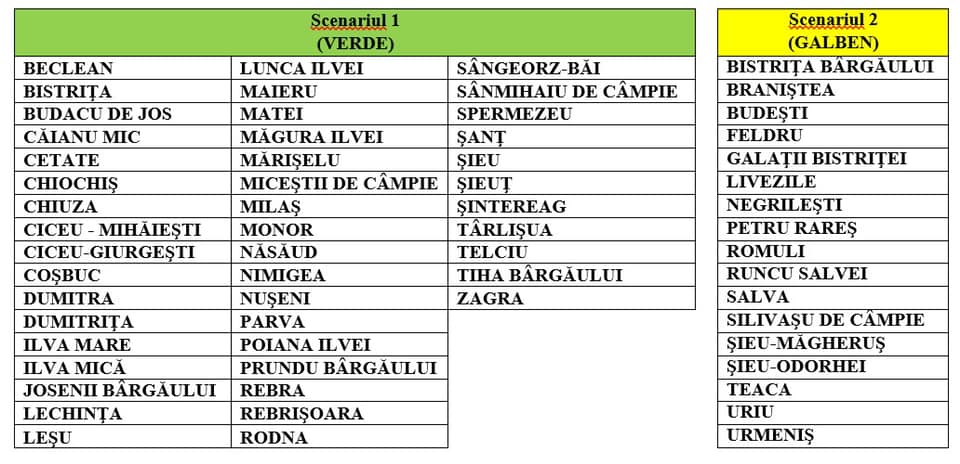 Astfel, în scenariul verde sunt școlile din 45 de unități administrativ-teritoriale, în vreme ce în scenariul galben sunt școlile din 17 comune, după cum urmează: