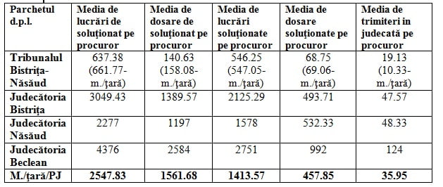 Media de dosare soluţionate pe procuror este mai mare decât media stabilită la nivel naţional, iar la Parchetul de pe lângă Tribunalul Bistrița-Năsăud această medie este aproape identică cu media pe ţară.