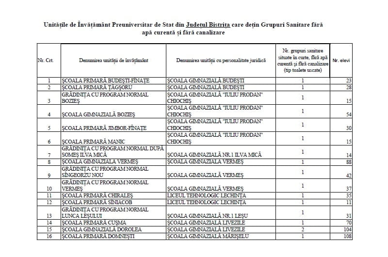 Parlamentarul a dat publicității o listă cu 41 de școli din mai multe comune ale județului care încă au grupuri sanitare afară, precizând că ”în Bistrița -Năsăud, din vina primarilor, 1696 de elevi din 41 de școli sunt condamnați să meargă la școală în condiții sanitare specifice Evului Mediu”.