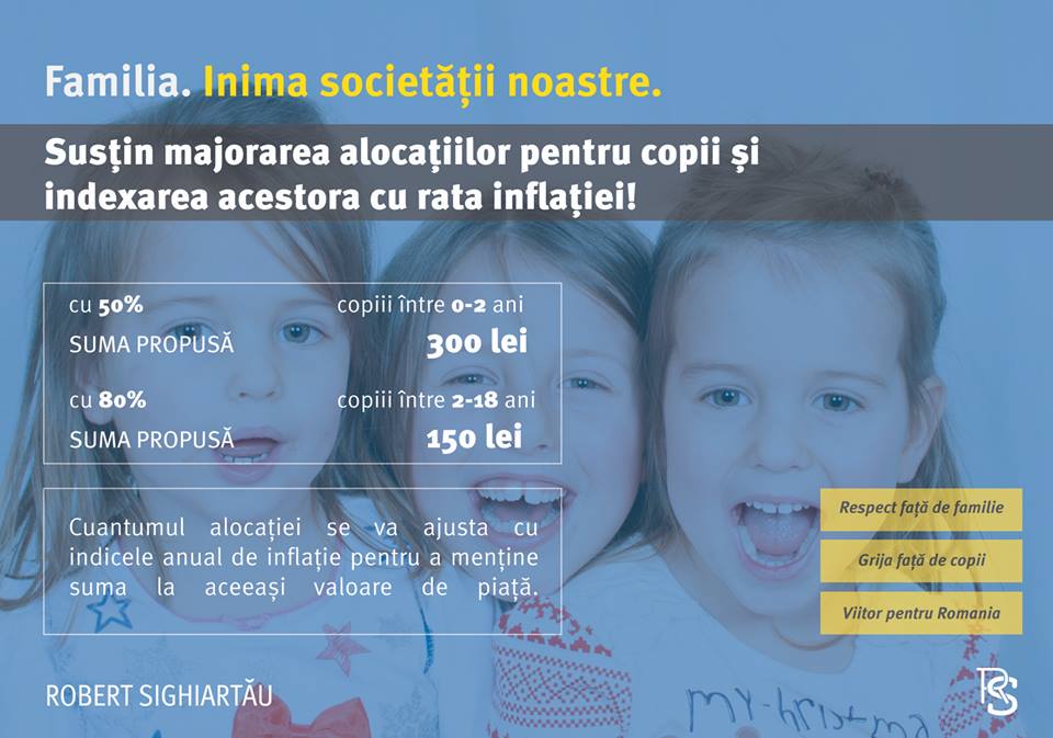 Practic, Robert Sighiartău propune ca alocațiile pentru copiii cu vârste între 0 și 2 ani să fie de 300 de lei, iar pentru cei cu vârste între 2 și 18 ani să fie de 150 de lei.
