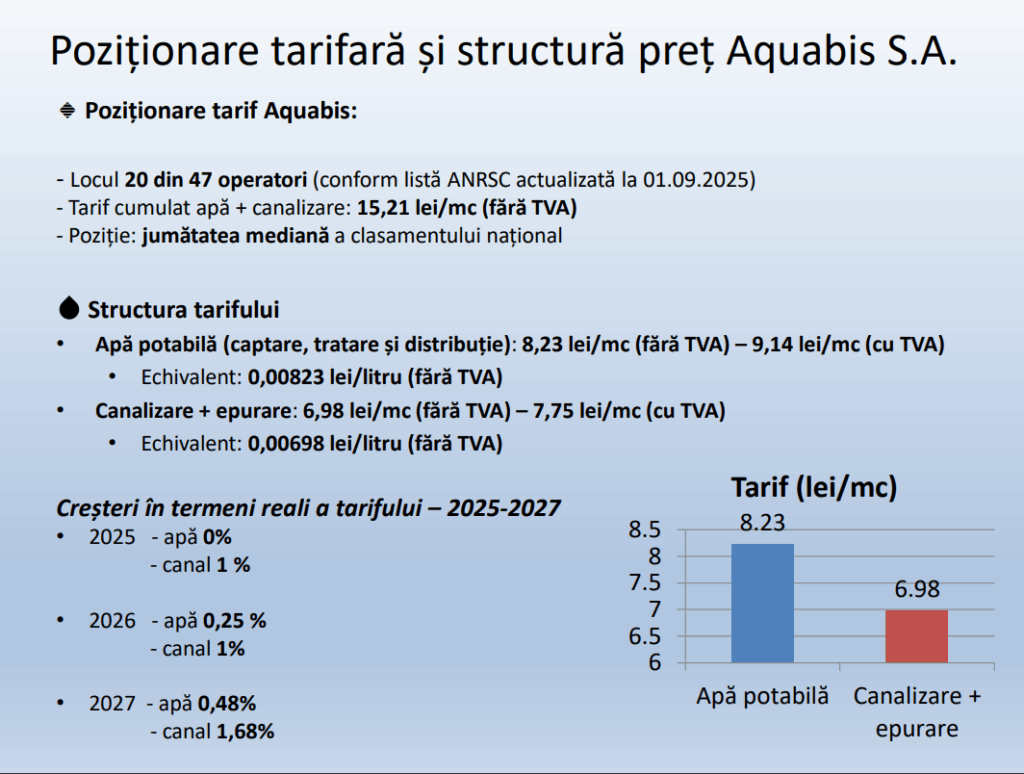 ”Din punctul meu de vedere, anul trecut, compania Aquabis a fost folosită ca și monedă de tranzacționare electorală, pentru a deservi diverse interese politice, nicidecum în beneficiul clienților noștri. Date fiind acestea, după ce am preluat mandatul de director general al companiei, una dintre primele acțiuni pe care am dorit să le fac a fost aceea de a analiza lista de prețuri naționale, ca să văd dacă într-adevăr avem cea mai scumpă apă din țară și ce putem face ca să reducem tariful. Am constatat că, la data de 1 septembrie, suntem pe locul 20 în țară din punct de vedere al tarifului perceput de cei 47 de operatori naționali. Tariful cumulat apă plus canal este de 15,21 lei/mc fără TVA, respectiv de 16,89 lei/mc cu TVA de 21%. Deși am încercat să explicăm unde ne poziționăm, cine este înaintea noastră și cine după, am văzut că persistă foarte bine mesajele și că s-a lipit foarte bine de noi eticheta că vindem cea mai scumpă apă din țară. Treptat, vom încerca să venim cu date reale. Nu vrem să spunem nici că avem cea mai ieftină, nici că cea mai scumpă apă din țară. Astăzi putem spune cu certitudine că suntem pe locul 20 din 47 de operatori, deci ne situăm către zona mediană. Îmi doresc ca în viitor să trecem în partea a doua a clasamentului, a operatorilor cu tarife mai mici”, a explicat Andrei Kozuk, marți, în prima conferință de presă susținută după preluarea mandatului de director general al companiei Aquabis.