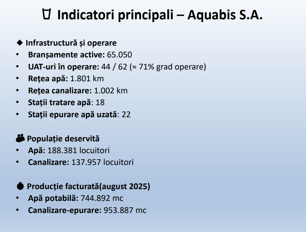 Aquabis asigură servicii de alimentare cu apă pentru circa 188.000 de locuitori și servicii de canalizare pentru aproape 138.000 de locuitori. Compania administrează aproximativ 1.800 de km de rețea de apă și aproximativ 1.000 de km rețea de canalizare, deține 18 stații de tratare a apei și 22 de stații de epurare apă uzată.