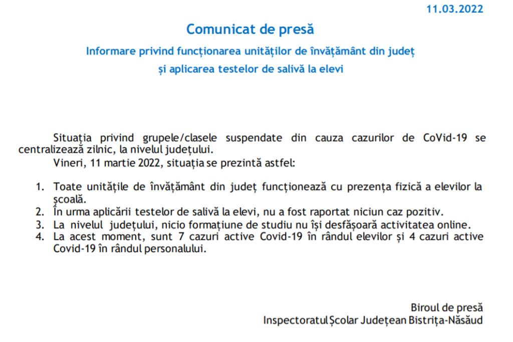 Totodată, IȘJ Bistrița-Năsăud precizează că, în urma aplicării testelor de salivă la elevi, nu a fost raportat niciun caz pozitiv.