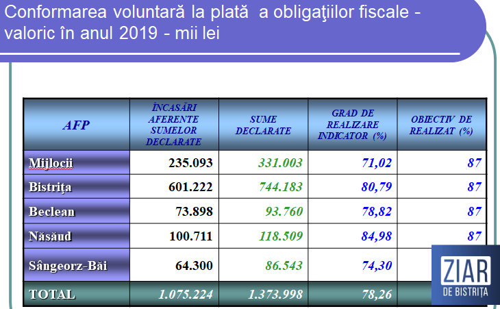”Din totalul celor circa 135.000 de agenţi economici administraţi de AJFP Bistrița-Năsăud, cu peste 30.000 de contribuabili mai mult decât în anul 2018, ponderea cea mai mare a contribuabilor o reprezintă persoanele fizice – 86,32 %, iar 13,68 sunt persoane juridice și instituții publice”, a mai adăugat Dorina Cicioc.