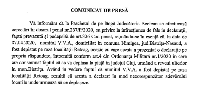 Până acum, la nivelul județului Bistrița-Năsăud au fost întocmite 6 dosare penale pentru infracțiuni de fals în declarații sau zădărnicirea combaterii bolilor.