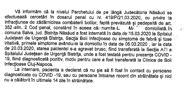 „La internare, pacienta a declarat că nu ştie să fi fost în contact cu persoane diagnosticate cu COVID-19 sau cu persoane întoarse recent din străinătate şi nici nu a călătorit în ultimele 14 zile în străinătate”, se mai precizează în comunicatul Parchetului de pe lângă Judecătoria Năsăud.
