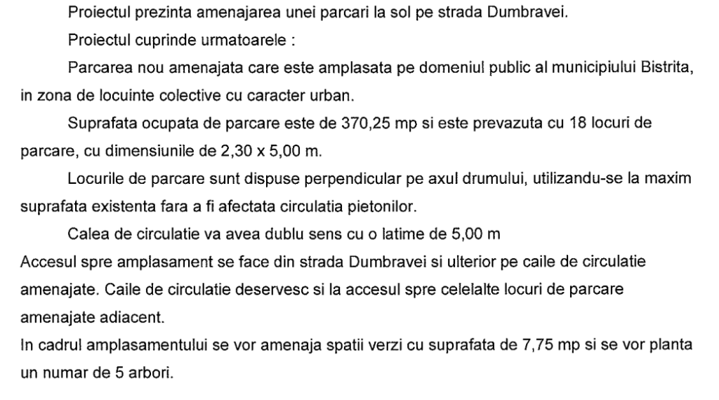 Pe strada Dumbravei, noua parcare va fi amenajată tot în locului unui fost punct termic demolat de Primăria Bistrița. Aceasta va avea un număr de 18 locuri de parcare, vor fi amenajate spații verzi și se vor planta 5 arbori. Valoarea investiției este de 637.000 de lei.