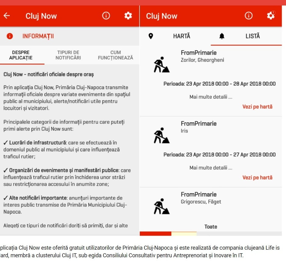 Prin aplicația Cluj Now, cetățenii și vizitatorii orașului sunt notificați despre evenimentele și lucrările care au loc pe domeniul public al municipiului Cluj-Napoca și care influențează traficul în oraș. De asemenea, prin intermediul acestei aplicații sunt transmise și alte notificări importante de interes public.