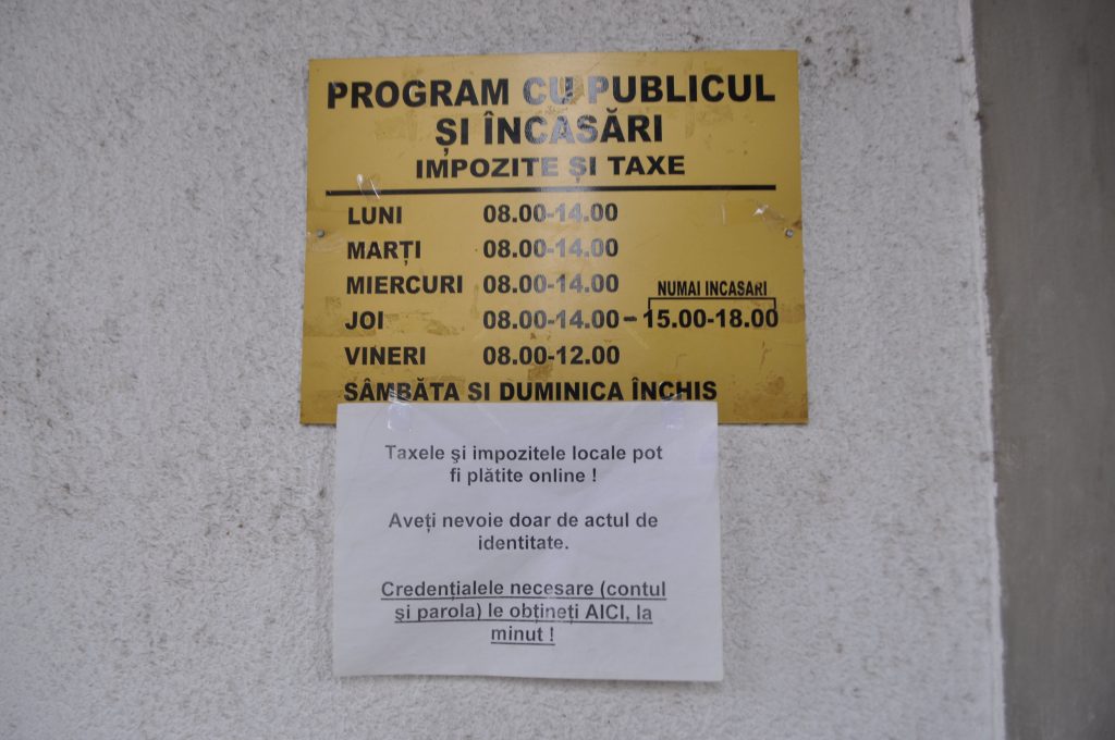 La taxe și impozite, programul de încasări e doar până la ora 14, spre exemplu. Plata impozitelor și taxelor se poate face on-line, dar NU printr-o aplicație a primăriei ci printr-o aplicația Ghișeul.ro, însă abia după ce primești un cod de acces din partea Primăriei Bitrița, pentru care trebuie să te duci personal la sediul instituției.