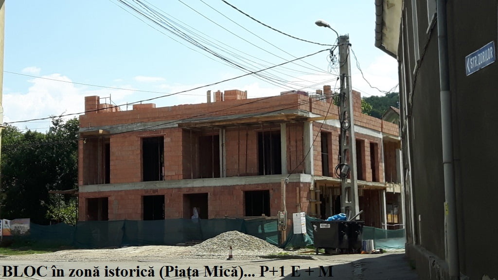 În Piața Mică se construiește un bloc de 2 etaje, pe o parcelă liberă, situată între case, pe o parcelă relativ-îngustă. Este zonă istorică, dar cu toate astea s-a aprobat construcția unui imobil cu parter + 1 etaj plus mansardă (care de fapt e un etaj retras). La parter va funcționa un spațiu comercial.
