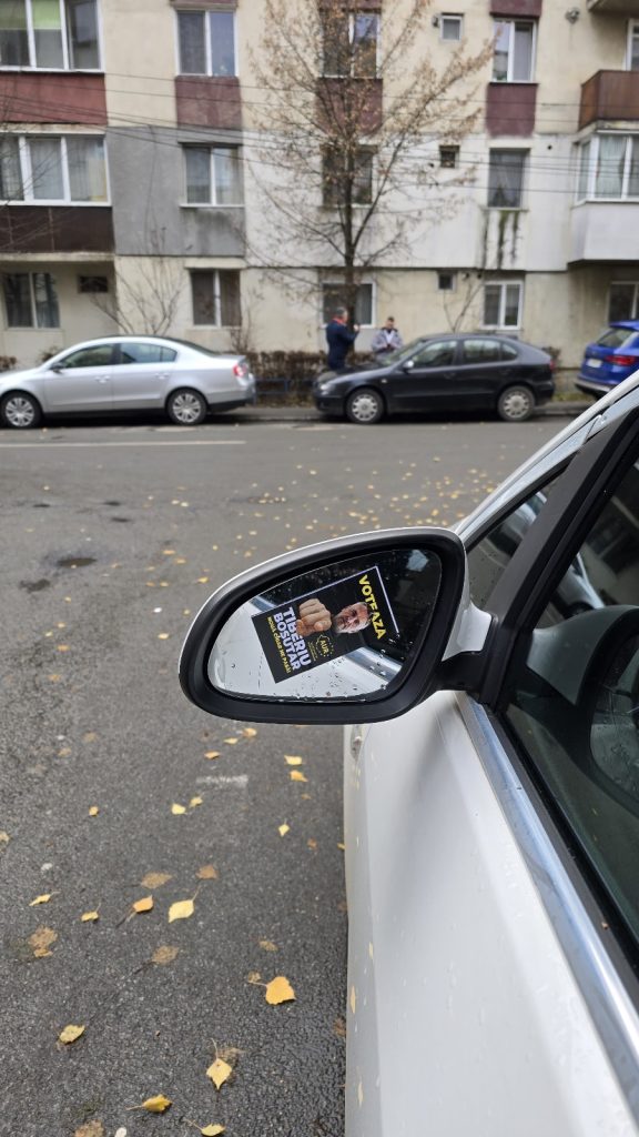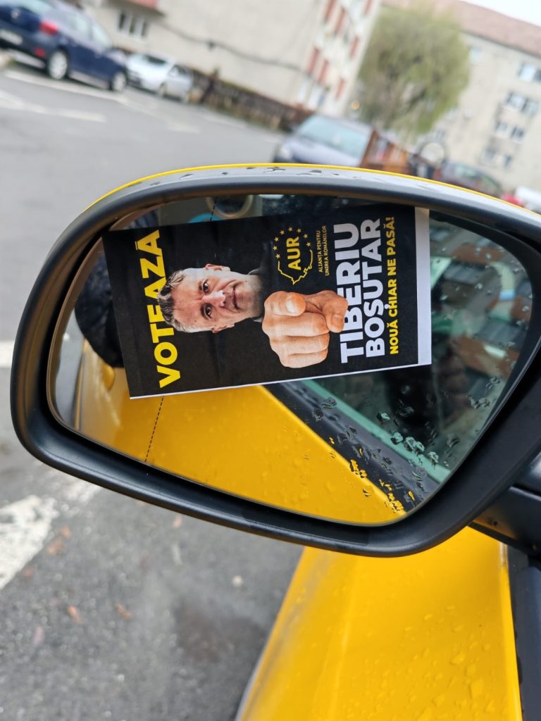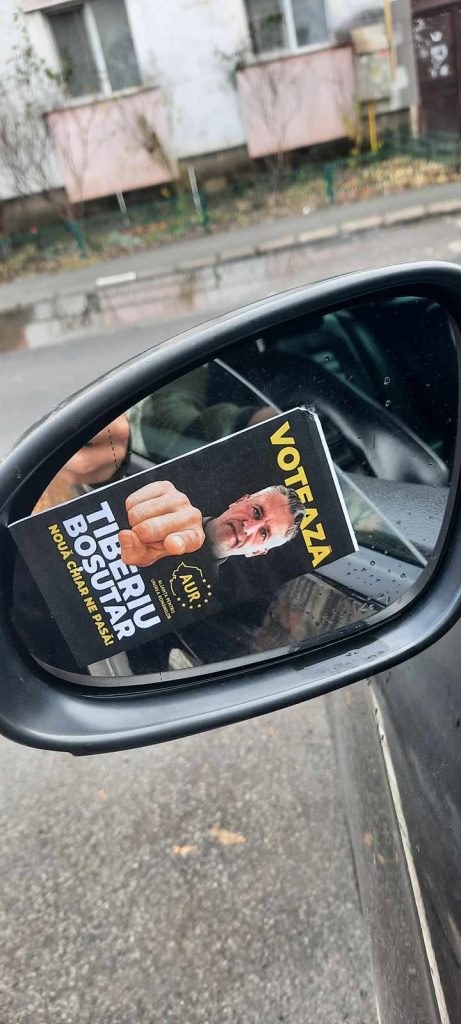 „În noaptea din 29-30 noiembrie, câteva mii de etichete electorale autocolante din hârtie au fost lipite pe oglinzile retrovizoare ale mașinilor parcate în municipiul Bistrița. Aceste etichete conțin însemnele AUR și imaginea candidatului nostru la Camera Deputaților, Tiberiu Boșutar.