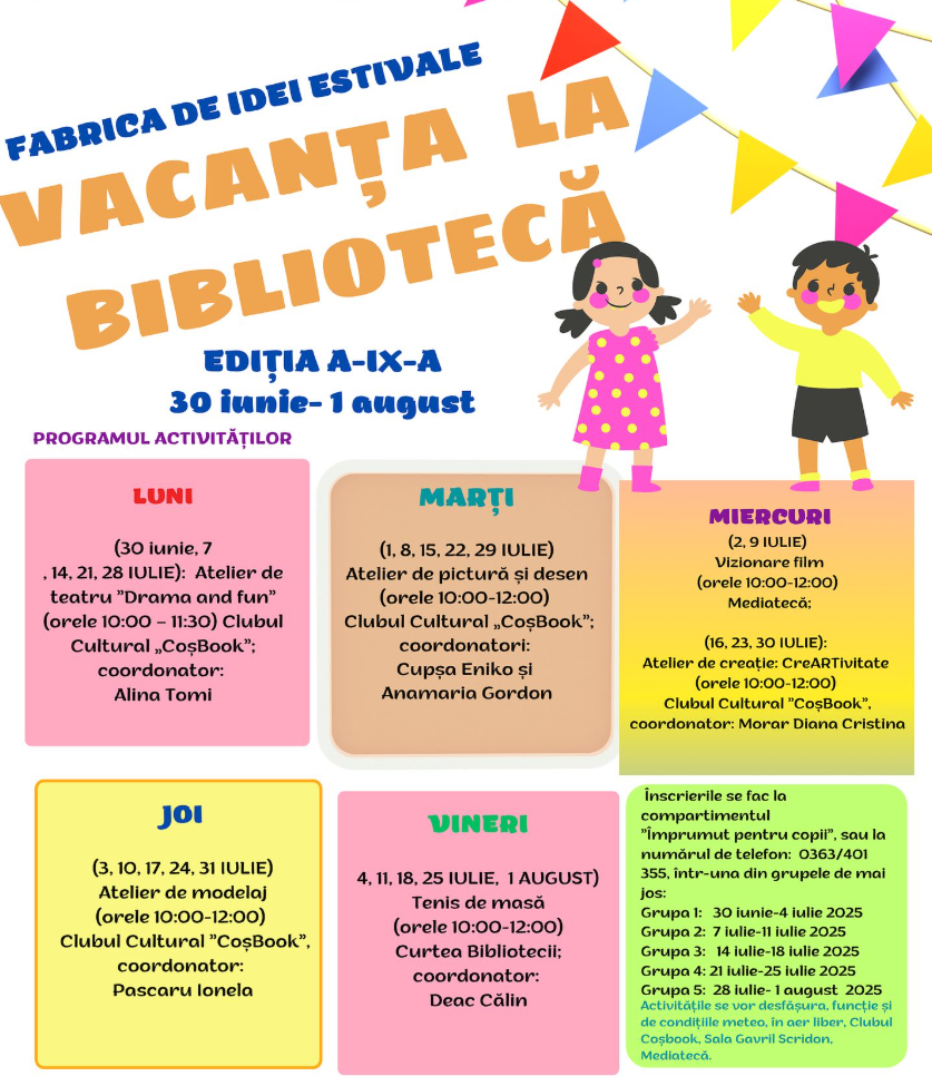 În perioada 30 iunie – 1 august, Biblioteca Județeană ”George Coșbuc” Bistrița-Năsăud organizează cea de-a IX-a ediție a Fabricii de Idei Estivale – ”Vacanța la Bibliotecă”, prin care propune o serie de activități destinate copiilor cu vârste între 7 și 12 ani.