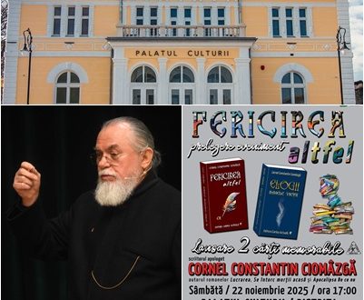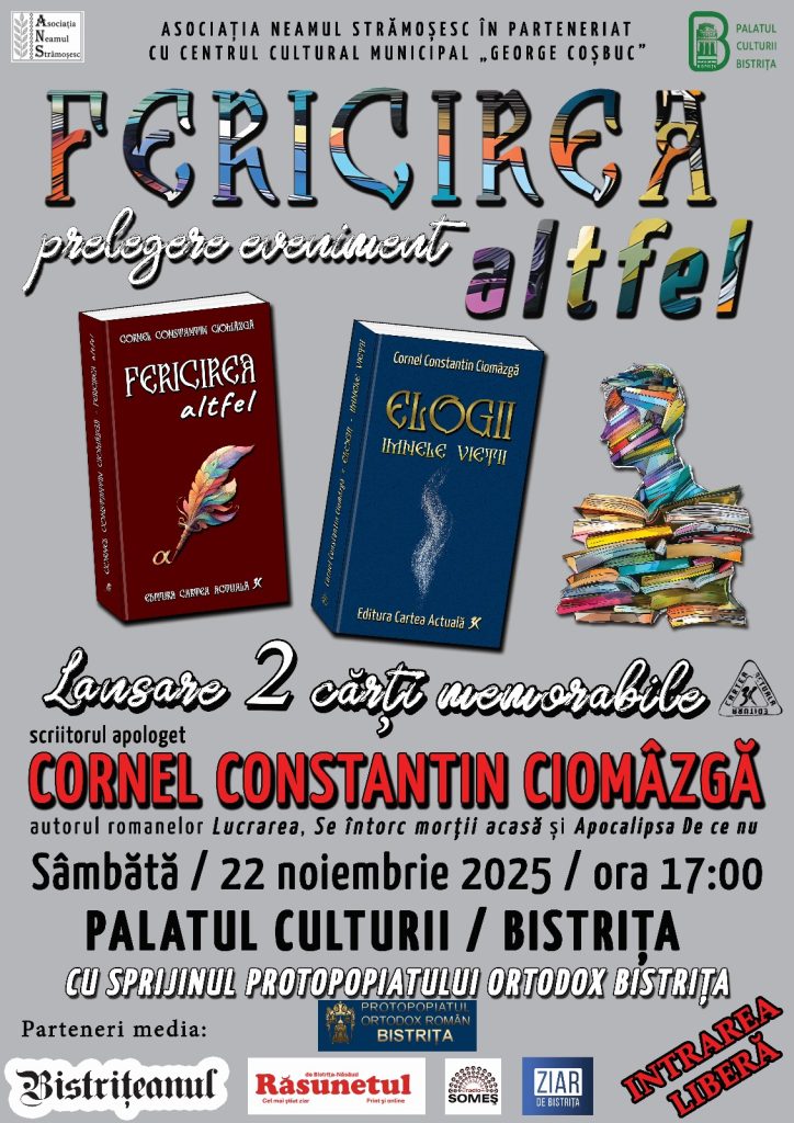 Asociația Neamul Strămoșesc în parteneriat cu Centrul Cultural Municipal „George Coșbuc”, organizează în data de 22 noiembrie 2025, ora 17:00, la PALATUL CULTURII din Bistrița, o prelegere memorabilă intitulată FERICIREA ALTFEL, susținută de scriitorul apologet Cornel Constantin Ciomâzgă.