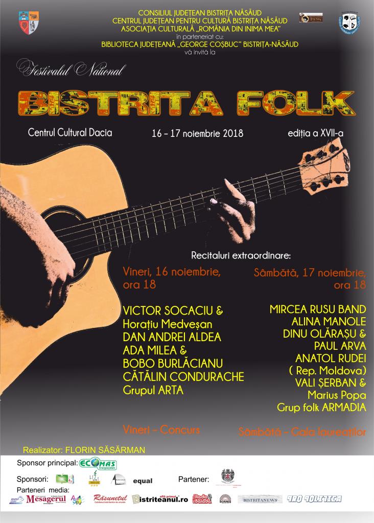 Festivalul Național BISTRIȚA FOLK 2018 se va desfășura în perioada 16 – 17 noiembrie la Centrul Cultural Dacia din Bistrița, în binecunoscutul format concurs plus recitaluri, sub patronajul Consiliului Județean Bistrița-Năsăud.