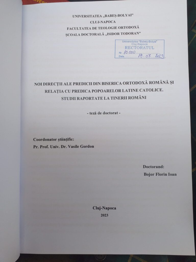 Îl felicităm pe Florin Bojor și în egală măsură pe distinsul îndrumător științific, părintele profesor Vasile Gordon” – a spus pr. prof. univ. dr. Vasile Stanciu, directorul Școlii Doctorale clujene.
