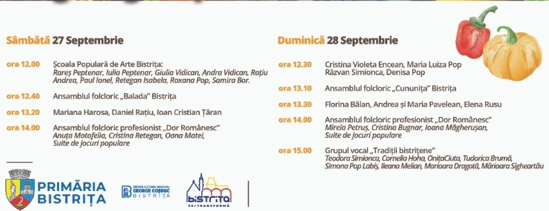 ”Toamna Bistrițeană” nu înseamnă doar produse locale, ci și atmosferă de sărbătoare. Cei care vor ajunge în centrul orașului vor putea să își facă provizii pentru iarnă, dar și să asiste la spectacole folclorice.