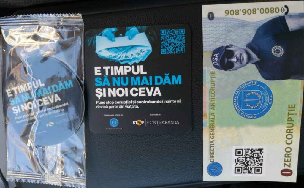 Pentru a le aminti de mesajul transmis și pentru a le pune la dispoziție informații utile, conducătorii auto au primit un plic cu materiale ale campaniei, care a inclus un odorizant auto, un suport pentru pahar și simbolica ”bancnotă de 0 corupție”.
