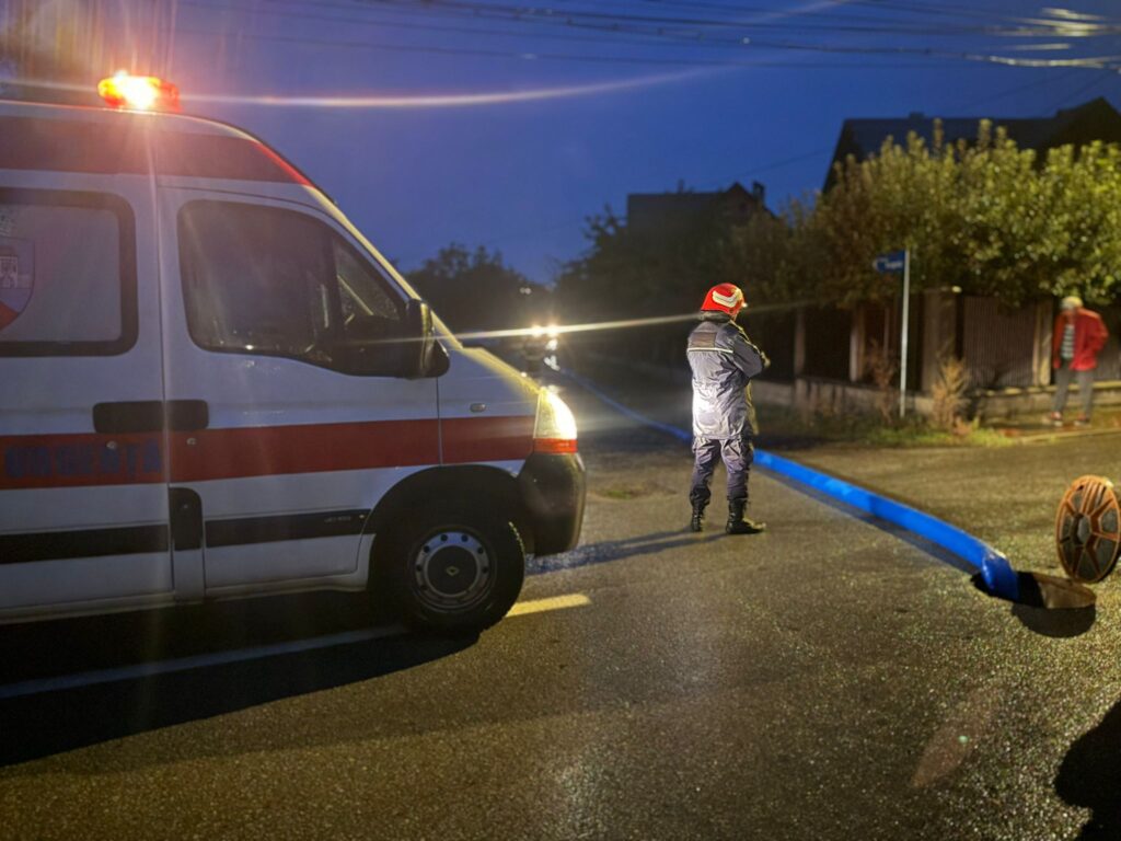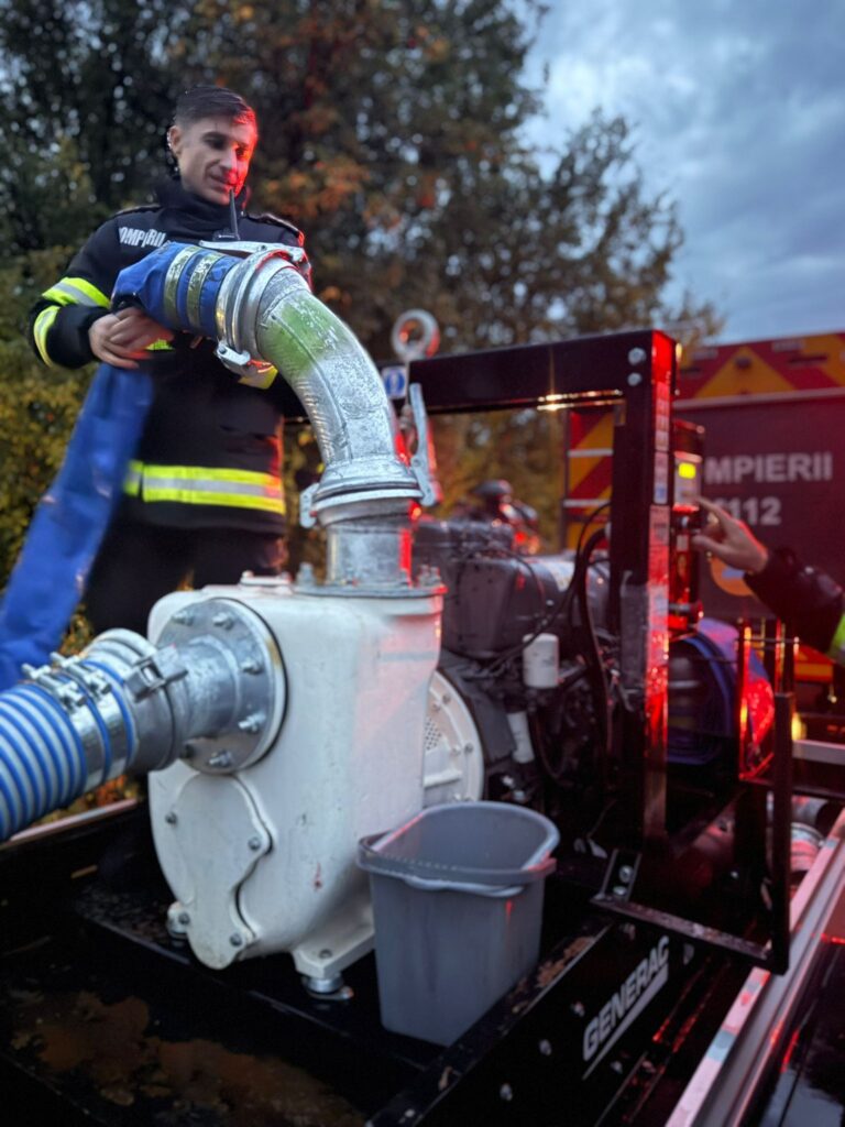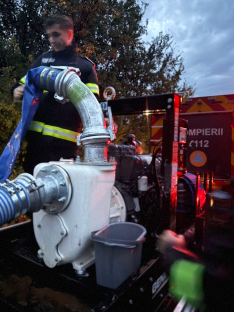 Intervențiile sunt în dinamică, iar pompierii acționează cu motopompe și mijloace specifice pentru evacuarea apei și limitarea efectelor produse de fenomenele meteorologice.
