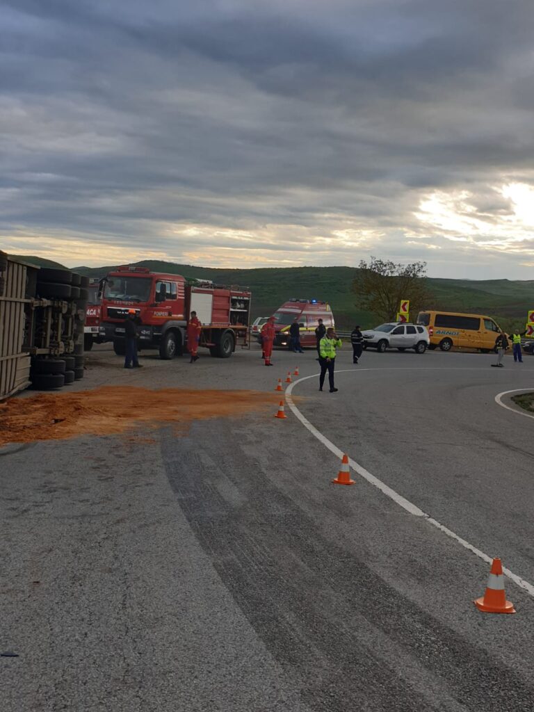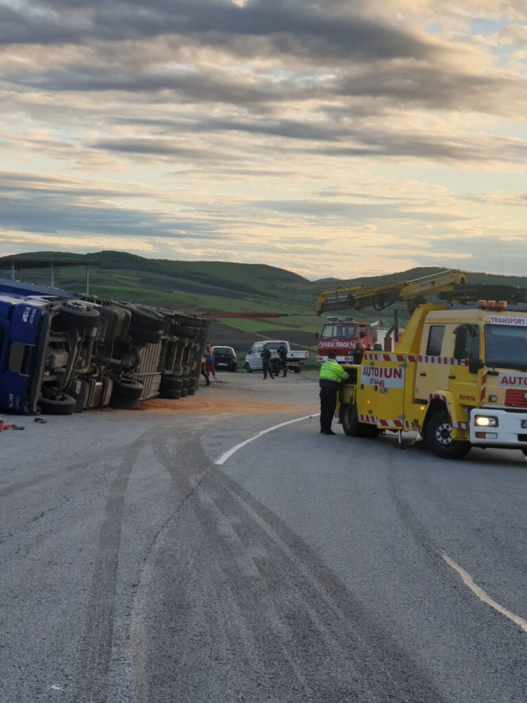 Din primele date transmise de ISU Bistrița-Năsăud, camionul s-a răsturnat.