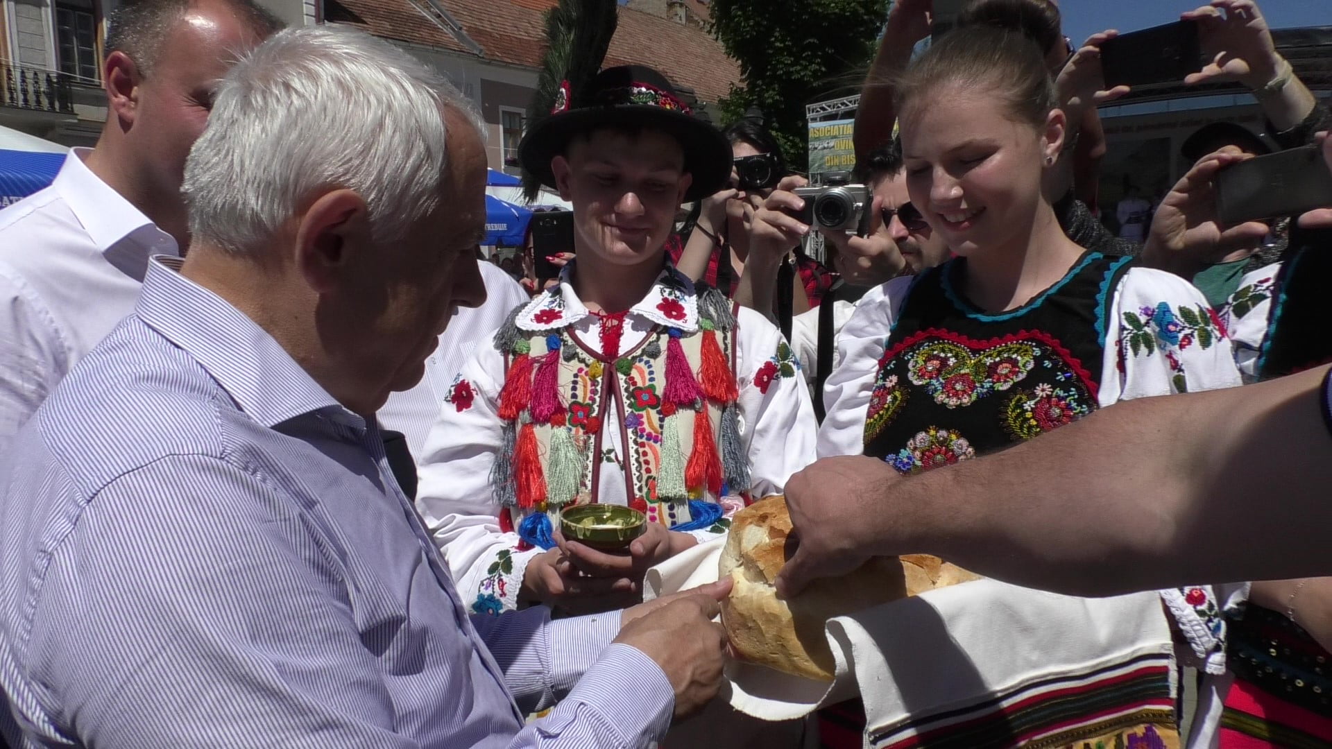După vizitele la fermele unor producători locali, ministrul a făcut un popas și în Piața Centrală din municipiu, acolo unde mai mulți comercianți au adus produse tradiționale, pe care chiar le-a degustat și, în plus, le-a și achiziționat. Petre Daea a fost primit de bistrițeni tot în mod tradițional, cu pâine cu sare și țuică.