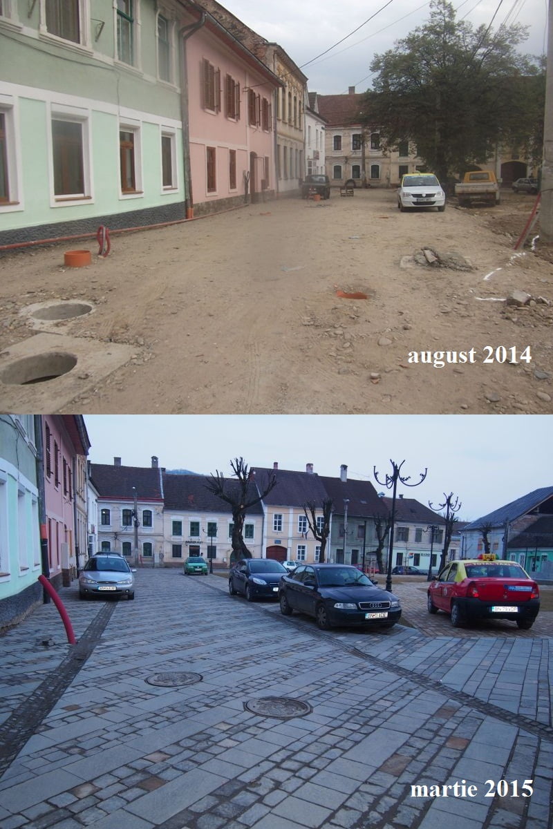 În Piața Mică s-a lucrat și pe timp de iarnă, iar din acest motiv pe alocuri pavajul s-a denivelat deja. Lucrarea e finalizată, dar străzile de legătură cu Parcul Municipal sunt dezastruoase. Zona e plină de praf și sufocată de mașini, care NU au unde parca, iar săptămâni la rând n-au fost văzuți oameni la lucru.