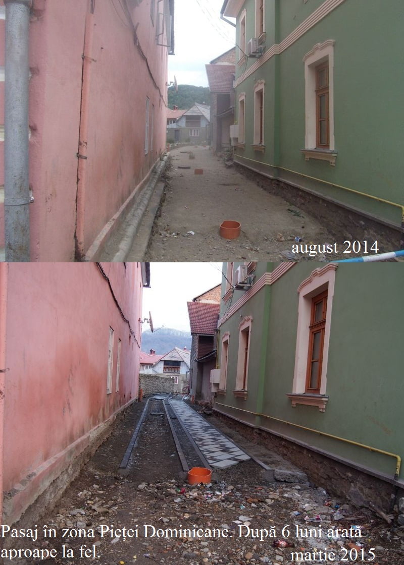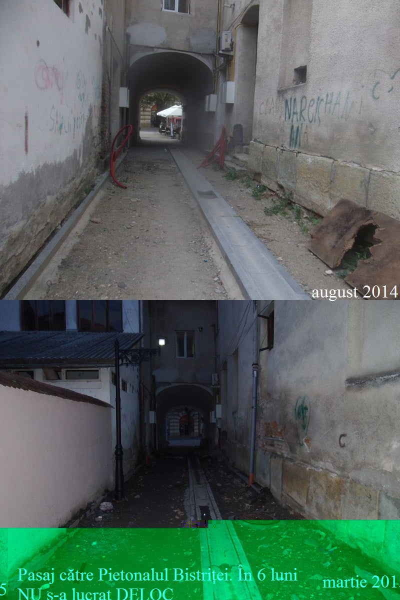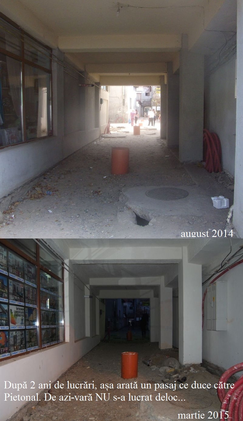 Pare incredibil, dar zona zero a Bistriței este ignorată total. Pasajele care permit accesul cetățenilor pe Pietonal sunt în același stadiu: cu denivelări, cu lucrările la rețele nefinalizate etc., mizerie de nedescris, da cel mai dureros este faptul că NU se lucrează efectiv, deși există front de lucru.