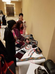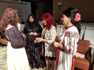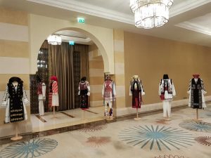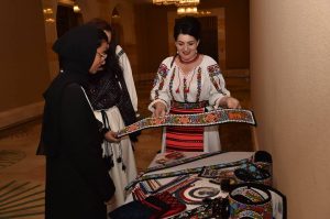 Români și emiratezi deopotrivă au admirat piese de port popular provenind din toate zonele țării, realizate integral manual de meșterii artizani Virginia Linul și Virginia-Maria Roș, care au pus în valoare costumul tradițional românesc în întreaga lui splendoare și autenticitate.