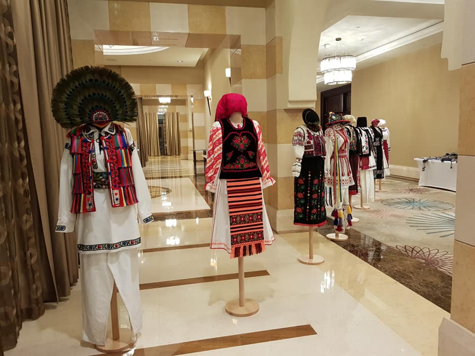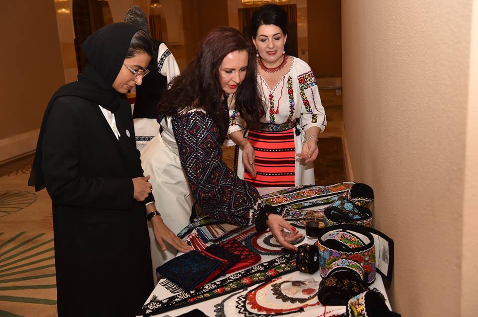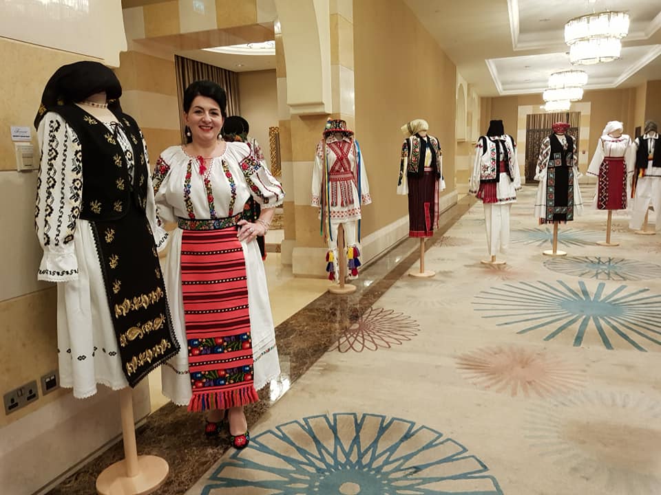 Români și emiratezi deopotrivă au admirat piese de port popular provenind din toate zonele țării, realizate integral manual de meșterii artizani Virginia Linul și Virginia-Maria Roș, care au pus în valoare costumul tradițional românesc în întreaga lui splendoare și autenticitate.