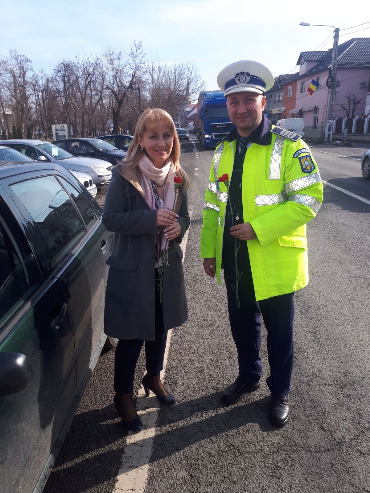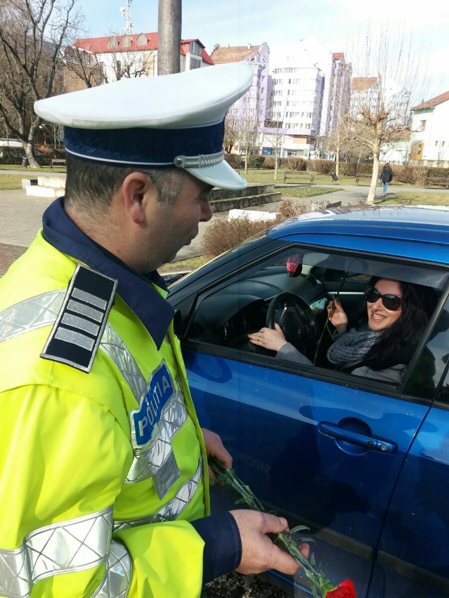Pentru că primăvara începe cu ele, astăzi, doamnele şi domnişoarele surprinse în trafic au fost oprite de poliţiştii de la Rutieră DOAR ca să fie felicitate.