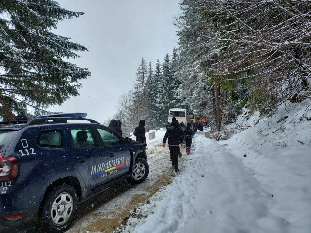 ”Până astăzi, cei 110 elevi s-au aflat la Complexul Turistic Alpina Blazna, în cadrul Programului Şcoala Verde. Având în vedere zăpada depusă în ultimele zile, pentru a coborî în siguranţă, aceştia au avut nevoie de sprijinul jandarmilor montani din Rodna. Drumul de pe traseul Alpina Blazna – Şanţ a fost curăţat de un utilaj al complexului de agrement, dar, având în vedere stratul proaspăt de zăpadă, exista riscul derapării autocarelor, ca urmare s-a luat decizia ca o parte din acest traseu să fie parcurs de către aceştia pe jos. Jandarmii montani din Rodna i-au însoţit pe tot parcursul acestui traseu, iar câţiva elevi cu probleme medicale au fost transportaţi în siguranţă cu autovehiculul Jandarmeriei montane până la locul îmbarcării în autocare”, a declarat Georgeta Cășvan.