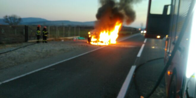 O mașină care circula pe DN 17 a fost cuprinsă, sâmbătă, de flăcări, incidentul având loc în apropiere de localitatea Șintereag, informează Inspectoratul pentru Situații de Urgență Bistrița-Năsăud.
