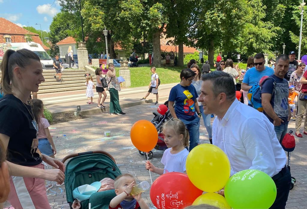 ”Bucurie, efervescență și culoare, la Bistrița, astăzi! Activitățile dedicate celor mici au început cu teatru de păpuși, baloane, desene pe asfalt, bomboane și personaje din povești, care sper că au reușit să vă coloreze această zi frumoasă. La mulți ani fericiți tuturor copiilor și celor care aveți grijă de ei: părinți, bunici, educatori, profesori!”, a transmis primarul Ioan Turc, care s-a aflat în mijlocul copiilor de ziua lor și le-a oferit baloane.
