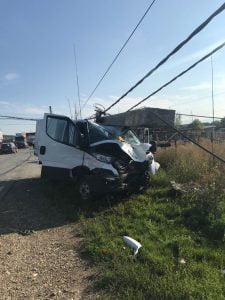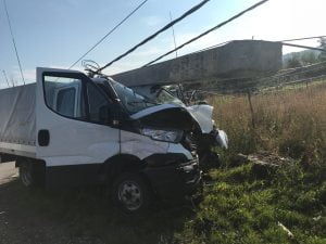 În urma impactului, autoutilitara cu numere de Cluj s-a oprit într-un stâlp de electricitate, pe care l-a doborât.
