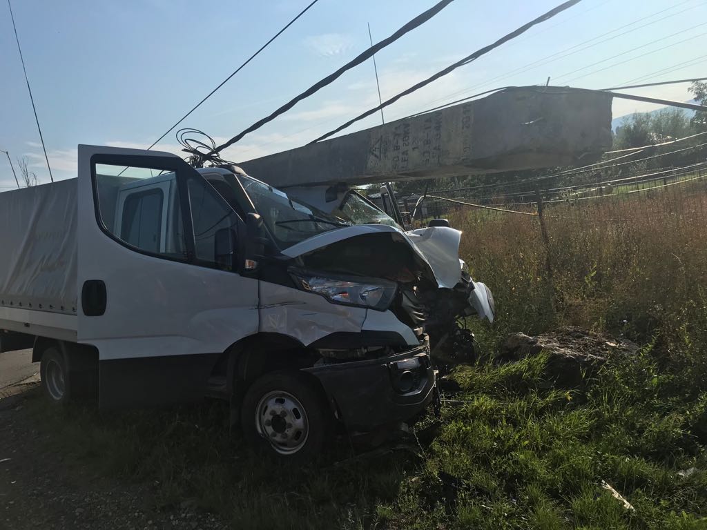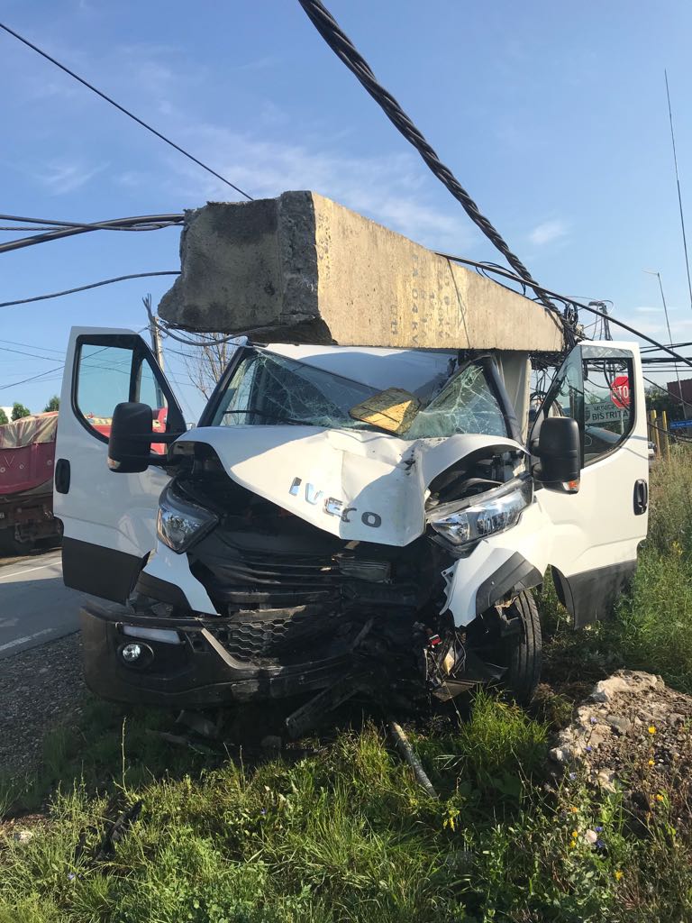 În urma impactului, autoutilitara cu numere de Cluj s-a oprit într-un stâlp de electricitate, pe care l-a doborât.