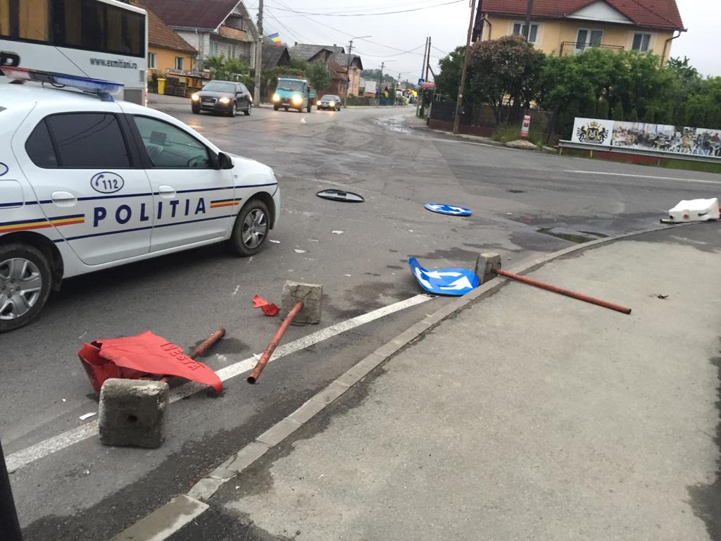 ”În dimineața de 25 mai, la intersecția drumurilor naționale 17C cu 17D, șoferul unui autoturism înmatriculat în județul Maramureș a pierdut controlul direcției de deplasare și a intrat în coliziune cu balizele de delimitarea a sensului giratoriu amplasat în intersecție. În urma impactului, autoturismul a fost proiectat în alte 3 autoturisme care erau parcate regulamentar, pe marginea drumului. După accident, persoanele care se aflau în autoturism au plecat de la fața locului”, se arată într-un comunicat al Inspectoratului Județean de Poliție Bistrița-Năsăud.