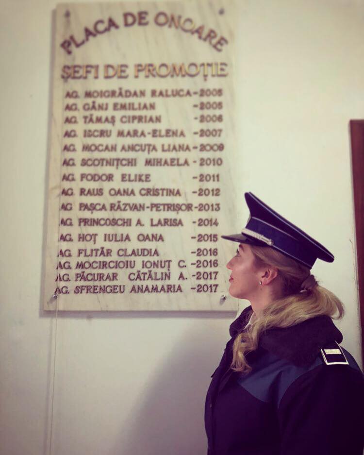 Potrivit portalului Gherla INFO, o tânără din județul Bistrița-Năsăud a fost șefa promoţiei 2016-2017, reușind să termine studiile cu media 9,85. Este vorba despre agent de poliție Sfrengeu Anamaria. Aceasta a fost urmată de bihoreanul Medrea Beniamin-Marius, cu media 9,73 și de maramureșeanca Toth Roxana-Anamaria, cu media 9,69.