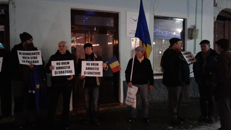 Câțiva bistrițeni au lăsat la o parte pregătirile pentru sărbătorile de iarnă și au ales să iasă în stradă pentru a protesta față de ordonanța privind amnistia și grațierea. Sediile formațiunilor politice ALDE și PSD din municipiul Bistrița au fost locul în care protestatarii și-au manifestat nemulțumirile.