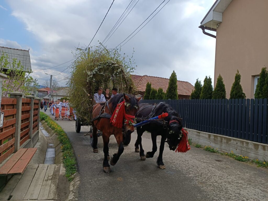 Anul acesta, ”Sângeorzul” a fost întruchipat de tânărul Liviu Pop, iar căruța “împănată” cu ramuri verzi de mesteacăn a fost pregătită de Puiu Ionuț și Puiu Mihăiță.