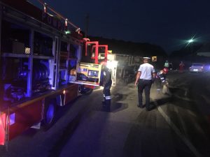 În urma impactului, camionul s-a răsturnat pe șosea, circulația desfășurându-se alternativ, pe un singur sens.